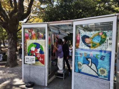 住小のみんなで折った千羽鶴を記載台につるしました。