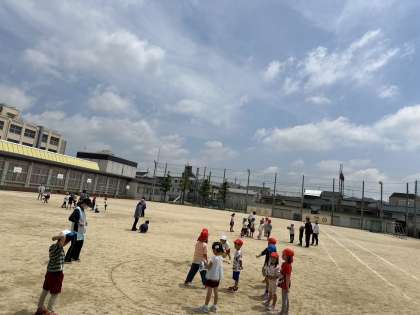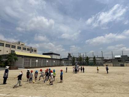 住吉幼稚園と住吉保育園の園児が、小学校の運動場で遊びました