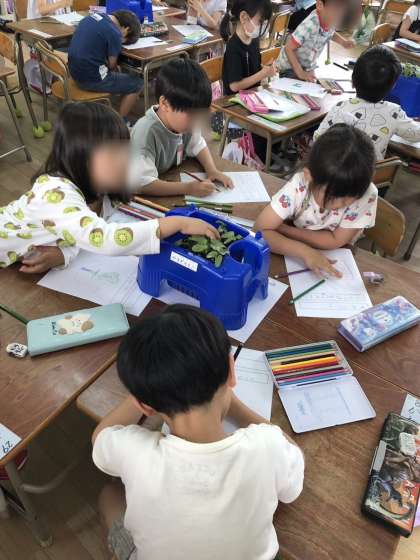 葉の形や茎の色などよ〜くみて「みつけたよカード」に双葉の様子を書いています。