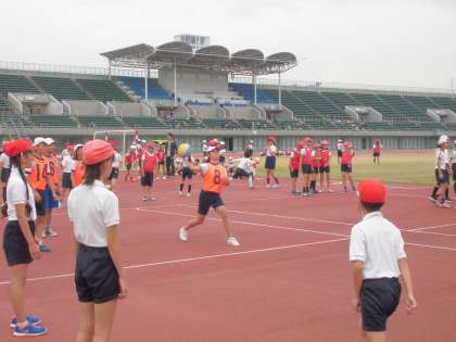 11/17(火)、住吉区内の6年生が長居陸上競技場に集まり、スポーツ交歓会が開催されました。午前中は、第2陸上競技場で、各校対抗のドッジボールとサッカーの試合をしました。午後からは、100m走と4×100mリレーを行う予定でしたが、あいにく途中から雨が降ってきたため、やむなく中止に。午後からはFIFAワールドカップや世界陸上が開催された長居陸上競技場(長居スタジアム)のトラックで走るという予定だっただけに、貴重な体験ができず残念です。