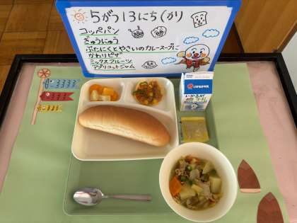 今日の給食は、コッペパン、豚肉と野菜のカレースープ煮、変わりピザ、ミックスフルーツ(缶)、アプリコットジャム、牛乳です。