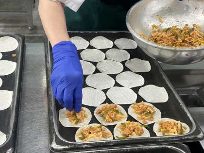 変わりピザは、調理員さんが朝早くから準備し、ぎょうざの皮1枚1枚に丁寧にツナなどの具材をのせて、焼いて作りました。乳アレルギーの児童も食べられるように、米粉などを原料とした、乳なしチーズを使っています。