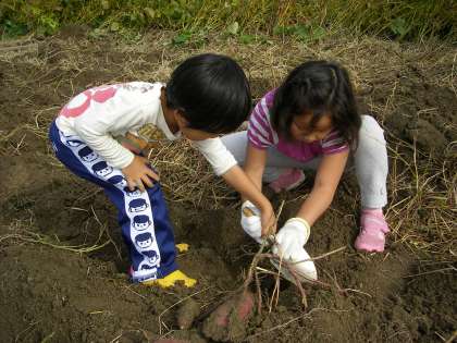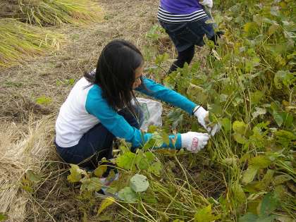 10/19(土)、琵琶湖湖東の滋賀県甲良町に親子等で出かけ、現地のみなさんのご協力により、稲刈り体験をしてきました。稲刈り以外にも、サツマイモ掘りや枝豆の収穫も体験しました。街中ではなかなかできない農作業を通して、みんなで交流を深めました。