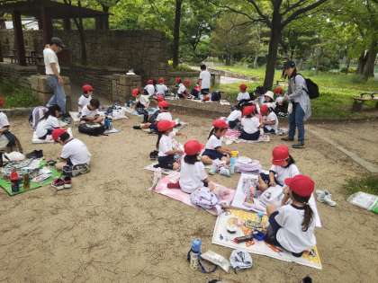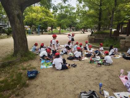 友だちと青空の下で食べるお弁当はとてもおいしそうです