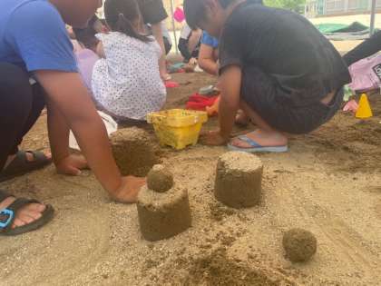 バケツやスコップで、みんな思い思いの形やだんごを作り、楽しそうでした。