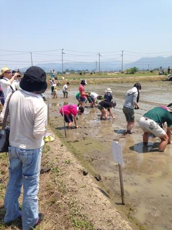 5/21(土)、琵琶湖東の滋賀県甲良町に親子等で出かけ、現地のみなさんのご協力により、田植え体験をしてきました。田植え体験以外にも生き物(ザリガニ、コイ、サワガニ)とのふれあい、ポン菓子づくりなども体験しました。