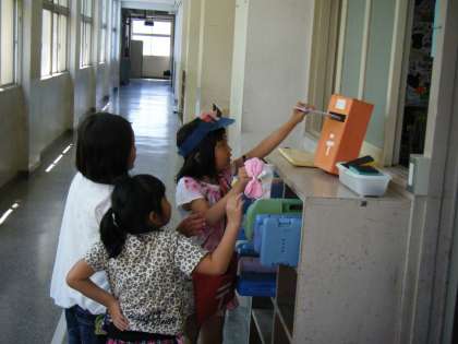 校内各所に郵便ポストや郵便受けを設置しており、手作りの帽子をかぶり、収集バッグを持った2年生の「郵便屋さん」がはがきの集配に活躍しています。また、一つの部屋を「ゆうびんきょく」にして、そこで消印を押したり、区分けをしています。
