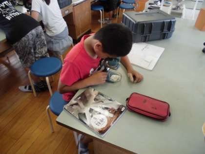 今日の5年生の理科の学習では池の中の水にプランクトンがいるかとうか調べるために顕微鏡を使った学習を行いました。グループごとに池の水をスポイトでプレパラートの上にたらして各グループで協力して調べ学習をしていました。