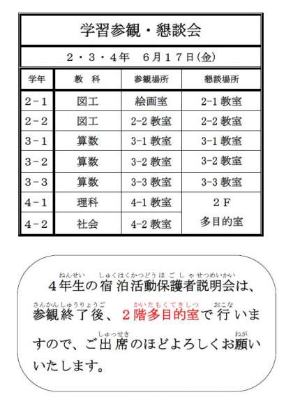 明日、6/17(金)の5時限目(13:40〜14:25)に2年生・3年生・4年生の学習参観と学級懇談会があります。各学級の参観の場所と教科についてお知らせします。 子どもたちのがんばっている姿や学習の様子を是非ご参観してください。