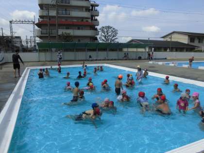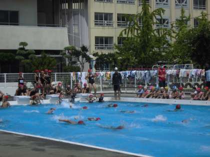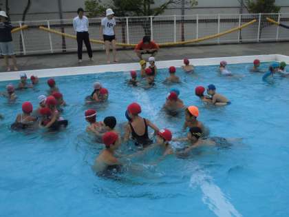 7/11(月)に住吉幼稚園、7/15(金)に住吉保育所の5歳児が本校のプールで5年生と交流をしました。まずは、小プールで園児とふれあいました。優しく接してくれる5年生に園児たちはすっかり安心し、遊んでもらっていました。5年生も小さな子どもたちの相手をして、「とても楽しい」と言っていました。その後、大プールに移り、5年生が25mを泳ぐ姿を披露しました。園児も「5年生がんばれ」と元気な声で応援していました。