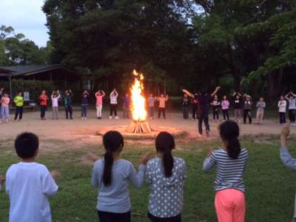 昨日の夕食の様子とキャンプファイヤーの様子です。キャンプファイアーではみんなでともした炎の前でゲームや歌等で盛り上がり、子どもたちにとって最高の思い出となりました。