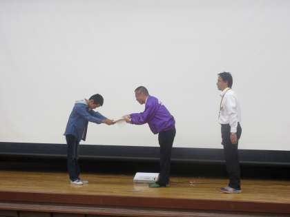 その後、にじいろ集会(たてわり班集会)では住吉区アイディア公募作品の表彰がされました。本校から6年1組の石井 草太朗さんが最優秀賞 同じく6年1組の西濱 嶺さんが優秀賞に選ばれ、代表で最優秀賞の石井さんが吉田 康人住吉区長から表彰状を受け取りました。