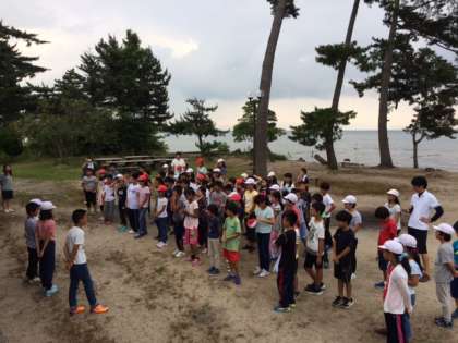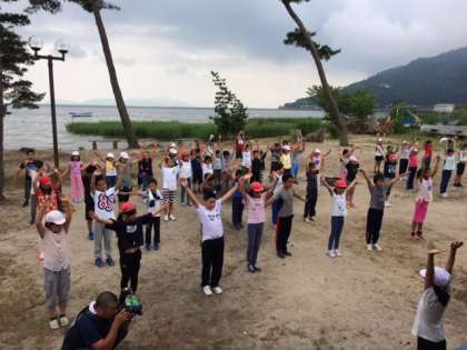 元気に起床して、清々しい湖畔で体操です。
