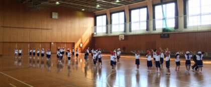 この写真は,1年生団体演技「とどけ!みんなわくわく100パーセント」の体育館での練習の様子です。隊形移動をどんどんしながら,ダンスに取り組んでいます。