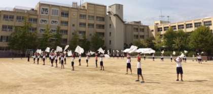 3年生団体演技「心を合わせてHands up!」の運動場での練習の様子です。隊形移動をどんどんしながら,フラッグを使い練習に取り組んでいます。運動会の日には、練習用の白い旗から,グループごとに分かれたカラフルな旗に変わります。楽しみにしていてください。