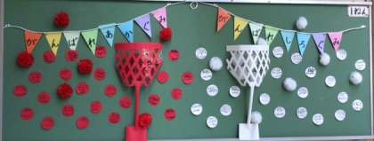 玉入れの練習予定は来週末ですので,素敵な廊下の掲示板の紹介です。小学校での初めての運動会が近づき,子どもたちはワクワクドキドキ。頑張って取り組んでいます。