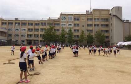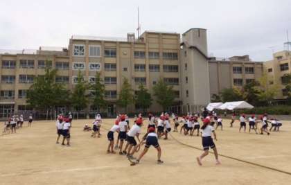 5年生は,運動場で団体競技「剛力無双〜つな取り合戦」の練習に取り組んでいます。大綱や短い綱を次々に引っ張って自陣に持っていきます。
