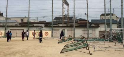 運動会の暑さ対策で好評のテントですが、先週末、台風に備えてたたみ飛ばないようにしっかり杭打ちもしました。