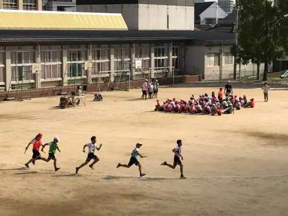 1時間目の5年生の練習風景ですが、リレー競技「疾風迅雷 紅白対抗リレー」、団体演技「舞い踊れ!ソーラン節2017」の練習の様子です。