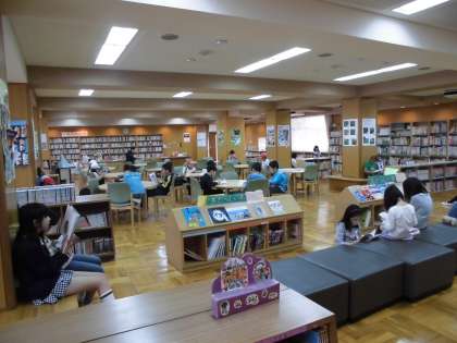 本校には、普通教室4教室分の広さがある学校図書館「ブックハウス」があります。蔵書数は約15000冊で、常時開館しています。図書の時間以外にも、休み時間や放課後にも利用できるので、自由に本を読んだり勉強をしたりと、子どもたちにとってお気に入りのスポットとなっています。写真は、休憩時間の様子です。