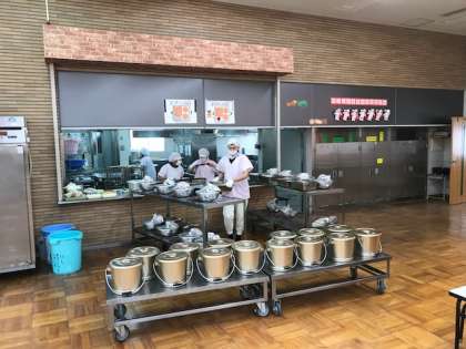 その後、給食調理員さんから「がんばって給食を食べて、大きくなってね」「一生懸命つくるから残さず食べてね」というお話がありました。