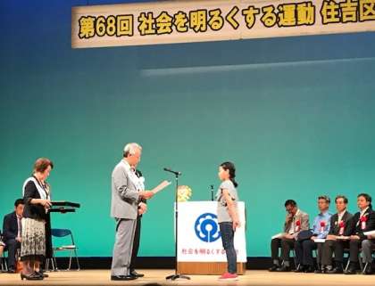 7月11日(水)住吉区民センター大ホールで,表彰を受けました。授賞式では,「それはだめ 私は言うよ 友だから」と,受賞された標語を大ホール舞台で大きな声で読み上げました。その後,住吉地区保護司会会長の岡本惣治さん,住吉区長の朝川晋さんから表彰を受けました。