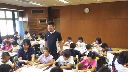多目的室で、キューブカレンダー作りを班ごとに分かれて行っています。
