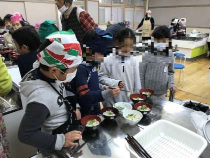 1月31日(木)、2月7日(木)、調理実習室で3年生がライフサポート協会の協力を得て地域のご年配の方々と、油かす(牛の小腸を揚げたもの)うどんの調理を通して交流をしました。
