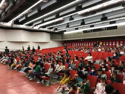 1〜5年生が講堂に集いましたが、6年生は先日卒業したので、少しこじんまりとしています。