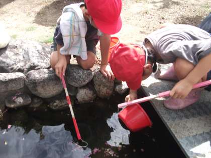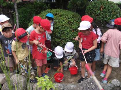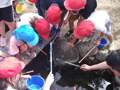住吉幼稚園の池でザリガニを釣らせてもらいました。