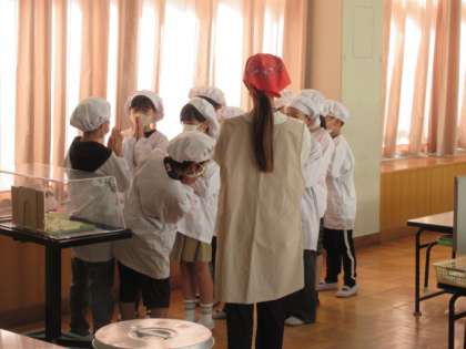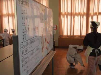 入り口では今日の献立の紹介や食材にまつわるお話を栄養教諭の芳川先生が毎日紹介しています。