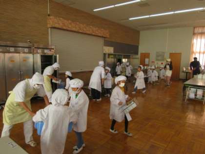 給食ホールでは全学年が給食を取りに来ています。