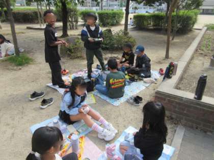 今日、本来ならば遠足の予定だった3年1組がお弁当持をもってきていたので、住小の森でプチピクニックしていました。