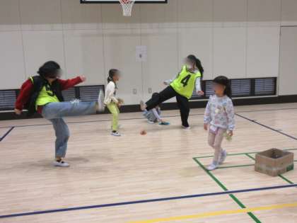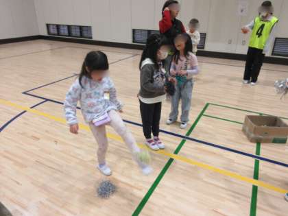 サッカーのリフティングのような遊びで、羽根みたいなものを地面に落ちないように蹴り続けます。