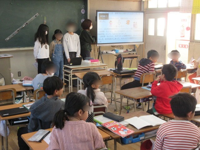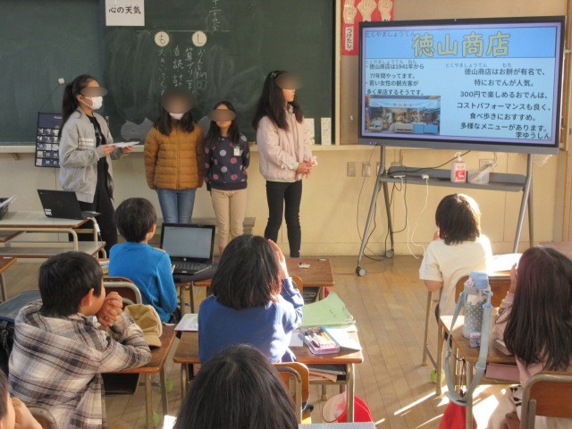 今日の朝の会の時間に、5年生は各学級に分かれてコリアタウンの発表を行いました。