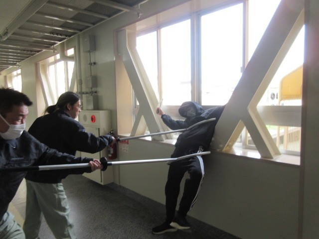 刃物を持った不審者(役の先生)が校舎内をウロウロと徘徊しています。