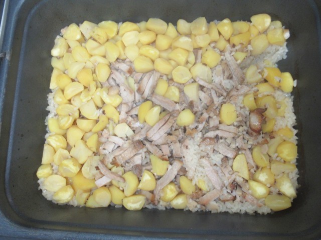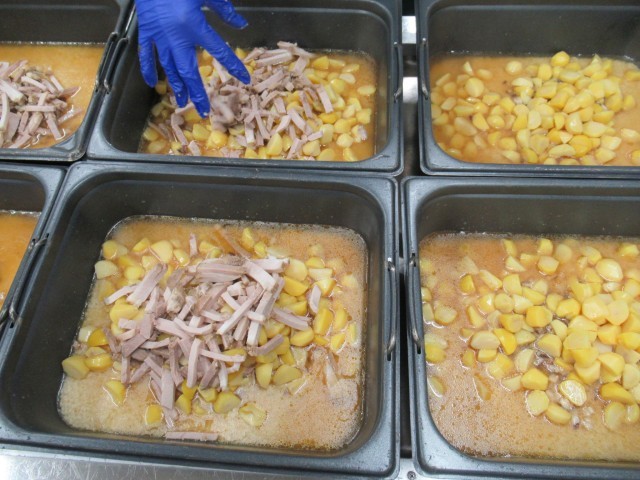 中華おこわは、もち米に焼き豚、くり、しいたけ、調味料を加えて、焼き物機で蒸し焼きにします。チキンブイヨンとごま油で、コクとうまみを出しています。もちもちとしていて、児童に大人気でした。