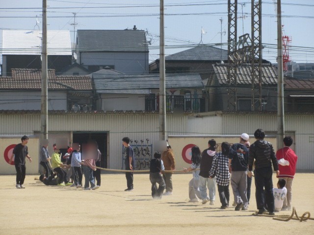 2組は運動場で鬼ごっこ、一輪車、綱引きなど、1年生に戻ったように楽しんでいました。