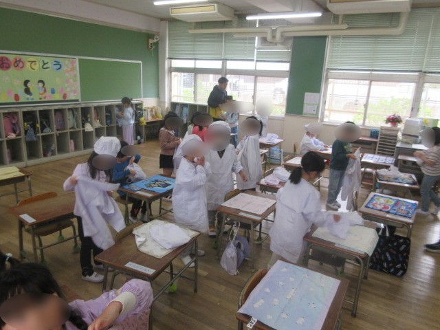 給食前の手の洗い方やエプロンの着方、牛乳のストローのさし方など、少しづつ学んでいます。