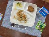 今日の献立は コッペパン 中華おこわ 卵スープ キャベツのオイスターソースいため...