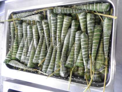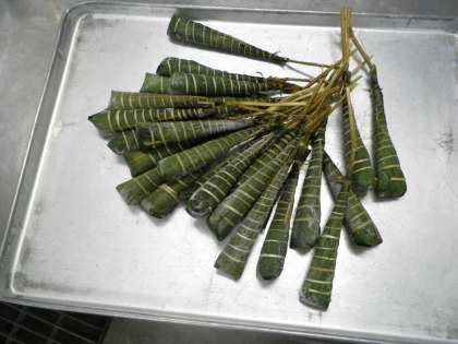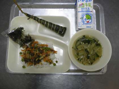 今日の給食は、牛肉のちらしずし・すまし汁・ちまきです。給食では、こどもの日の行事献立に「ちまき」がつきます。ちまきは米粉等で作ったもちを笹の葉にくるみ蒸してます。「こどもが元気で大きくなりますように」という願いがこめられています。