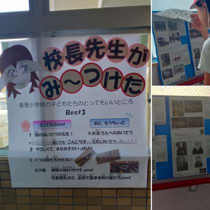 玄関ロビーに「校長先生がみ〜つけた」を、校長室の前には、子どもたちに読んでもらいたい新聞の情報をいろいろと掲示しています。