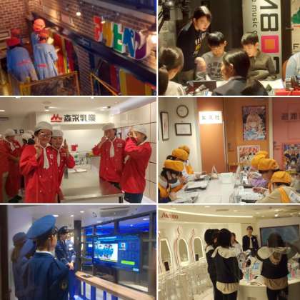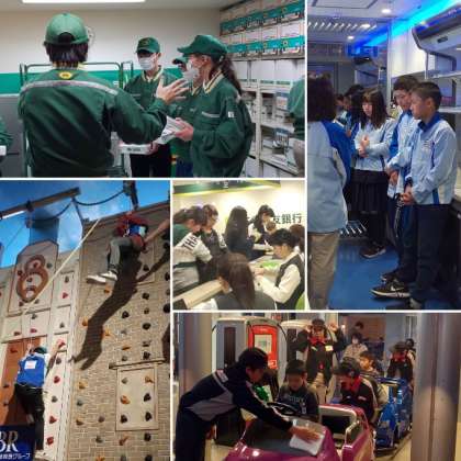 6年生は、卒業遠足でキッザニア甲子園に来ています。たくさんあるパビリオンの中から体験したいものを選び、本格的な設備や道具を使って、仕事やサービスにチャレンジしています。