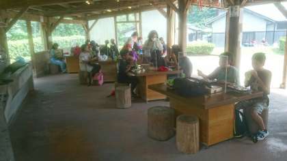今日のお昼ごはんは、お弁当です。 周りを山々に囲まれて、気持ちのいい場所での食事です。