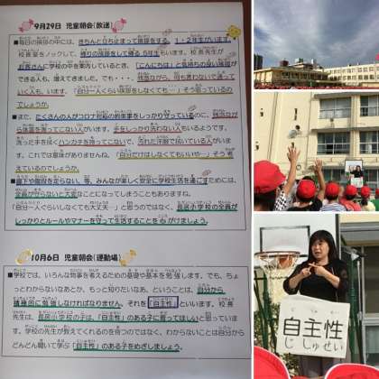 「学校では、いろんな物事を考えるための基礎や基本を勉強します。でも、ちょっとわからないなあとか、もっと知りたいなあ、ということは、自分から積極的に勉強しなければなりません。それを、「自主性」といいます。校長先生は、長居小学校の子は、「自主性」のある子に育ってほしいと思っています。先生が教えてくれるのを待つのではなく、わからないことは自分からどんどん聞いて学ぶ「自主性」のある子をめざしましょう。」
