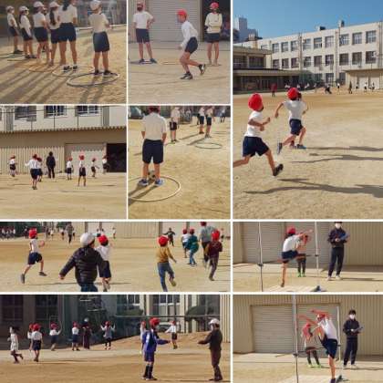 ※写真:体育の授業や休み時間の様子です。体育の授業では、フープを活用してフィジカルディスタンスに努めています。休み時間は、運動場でかけ足の記録を自主的に伸ばしたり、接触を避けるために「影ふみおにごっこ」をしていました。