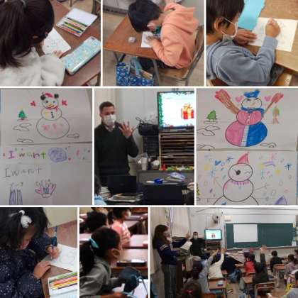 季節の教材を用いて、映像で音楽を聴いたり観たり、プレゼントのBOXの中を当てたりしました。また、Snowmanをデザインして、クリス先生と一緒に英語の勉強をしました。