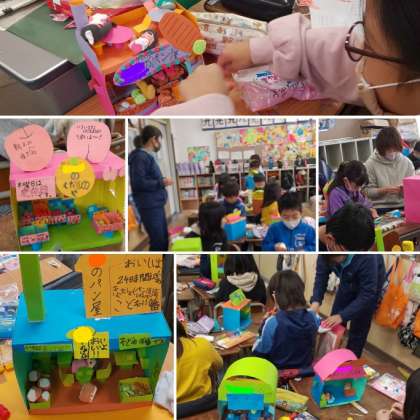 写真は1・2限目の3年3組の図工の授業「いらっしゃい!わたしのお店へ」の様子です。