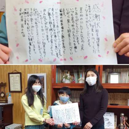 写真は、火曜日(19日)に給食委員会から感謝状をお渡しした時の様子と本校の給食調理員の皆さんです。いつも身体に良い、おいしい給食を作ってくださり、ありがとうございます!