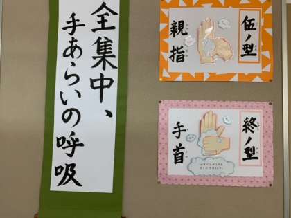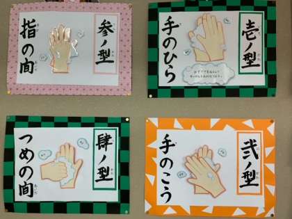 毎週金曜日の午前中に、養護教諭を目指している学生ボランティアさんが来てくれています。保健室前の掲示物には子どもたちが大好きなアニメにちなんで、手洗いについての掲示物を作成してくれました!着物の模様もコピーではなく手書きや画用紙が貼られていたり、手洗いの手や泡も一つ一つ画用紙で作られています。子どもたちは思わず立ち止まって見入ってしまう素敵な掲示物となりました。『子どもたちが、少しでも楽しく手洗いをする週間が身に付き、感染予防につながってほしいです。』という思いが込められています。
